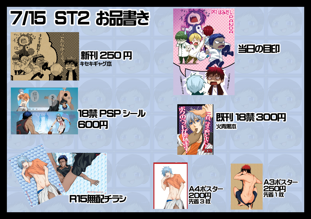 10月にちゃんとしたものを出せるようにいま作業しています。('、3_ヽ)_ たぶん仕事が落ち着いた気がするので・・・多分・・・ 草加さんのスペースに委託していただくことになるかと思いますので、そちらでお求めください。 一応、黒バスでサークル参加するので自スペにも少し置きますが…どうなることやら… スペースにお越しくださった皆様、 話しかけてくださった皆様 本を手にとってくださった皆様 差し入れをくださった皆様 本当にありがとうございました。 アクエリでのイベント参加は今回で最後になります。 今回落としてしまった本以外で、無印、映画、OVA、EVOL全部合わせた話を考えているのですが、なかなかまとまらず作業にうまくはいれない現状でして… 脳内でいろいろまとまって本の形になりそうになったらこそっと申し込むかと思います。 アクエリはほんと男性の方に来ていただけて本当に嬉しいです( ´ ▽ ` ) やっぱり腐ってもロボットアニメ!男性に読んでもらえてこそなそういう何かがありまして、 今回は本当に嬉しかったです( ´ ▽ ` ) もちろん女性の方にも来ていただけて嬉しくて・・・ミカゲ嫌われてそうなのに、来てくださってほんと嬉しくて・・・ 今回のスペースの不甲斐なさに本当に申し訳なくて。 本当にすみませんでした。 あと、ツイッター上で『あんな犬いたっけ?』みたいなツイートを見かけていたので ポロン本をつくるのちょっと悩んでいたんですが、無配のポロンに結構反応いただけてすごくうれしかったです。 ちゃんとまともな形になるよう頑張ります。 ではでは、ほんとうにありがとうございました( ´ ▽ ` ) オンリー本当におつかれさまでした!! まさか既刊、新刊、無配チラシがなくなってしまうという事態に陥るとは思ってませんでした(゚Д゚) というか、一応用意していったつり銭が足りなくなっていろんな方にご迷惑をおかけしてしまい本当に申し訳ありませんでした。 ご協力いただいた皆様本当にありがとうございました!! おかげでなんとか乗り切ることができました!!!次は微妙な値段にならないように早め入稿したいです。(´;ω;`)気持ちだけは・・・ 一応再版することにしたので、月末には、虎さんとKブさんに並んでるかなぁと。 10月のイベントにも少し持っていけるかなぁと思ってます。 3P本はもう再販はしないと思います(m´・ω・`)m絵がな・・・初めて描いた感満載で辛いのだよ… 遅くなりましたが、 スペースに起こしくださった方、 本と手にとっていただいた方、 PSPをグリグリしてくださった方 スケブをお願いしてくださった方、 差し入れを下さった方本当にありがとうございました。 いろいろいたらない点が多く本当に申し訳ありませんでした。 あと、売り子をしてくださたKさん本当にありがとうございました!! もうね・・・ほんとうにいろいろお願いしっぱなしですいませんでした('、3_ヽ)_ 奥付に名前書き忘れるし・・・ほんと絵描いてもらったのに何もお返しできてない・・・('、3_ヽ)_ 本当にありがとうございました。 身動き取れずに取り置きをお願いしたにもかかわらず行けそうにない!!と思っていたら、まさか届けていただいて・・・ 本当にありがとうございました・・・゚(゚´Д`゚)゚ テンパリすぎてお金払えてなくてすみません、次のイベントで・・・(´;ω;`) ほんと・・・サークルチェックしずにイベント行っちゃいかんね・・・うん あと50円とかつくほんはいかんね・・・ものすごくいかんね 今回の教訓です でも、いろいろ片付いたあとに少し挨拶にいけてよかったです!!! もっとゆっくりお話したかった!! 次はスケブの受付数減らしてお話しにいこ・・・うん 挨拶しにいこ・・・ アフターは凄かった・・・ レイヤーさんたちってなんであんなに美人さんなのにぶっ飛んだ方が多いんだろう… 笑いすぎてホント呼吸が辛かったです(*´∀`*)あと、キャラ愛がすごくて負けてられないなぁと・・・(`・皿・´) いただいた名刺をニヤニヤヘラヘラ見ながら眼福眼福しながら作業させていただきます(*´∀`*) そんなこんなで、本当に楽しいイベントでした 本当にありがとうございました!! 最後に本当にKさんありがとうございました!!!! ほんともう!!すき!!! 無事に新刊入稿完了しました。 ので、ざんねんなPSPシールだけではなくなりました。 新刊は全年齢対象ギャグ本です。 PSPシールは、今回ちょっとはっちゃけすぎてしまったので、18禁になります。 無配ちらしもR15になります。 ご理解よろしくお願い致します。 スペースは【P51】はみだしPANDA です。 お願い 今回新刊が250円と微妙な金額になってしまいました。 つり銭をなるべく用意はしていきますが、足りなくなる可能性があります。 お手数ですが、なるべくちょうどの金額をご用意いただけると嬉しいです。 よろしくお願いいたします。 年齢指定について ■※グッズと既刊が18禁・チラシがR15ですので、当日は本人確認のできる写真付きの身分証明書(免許証・パスポート、TASPO、